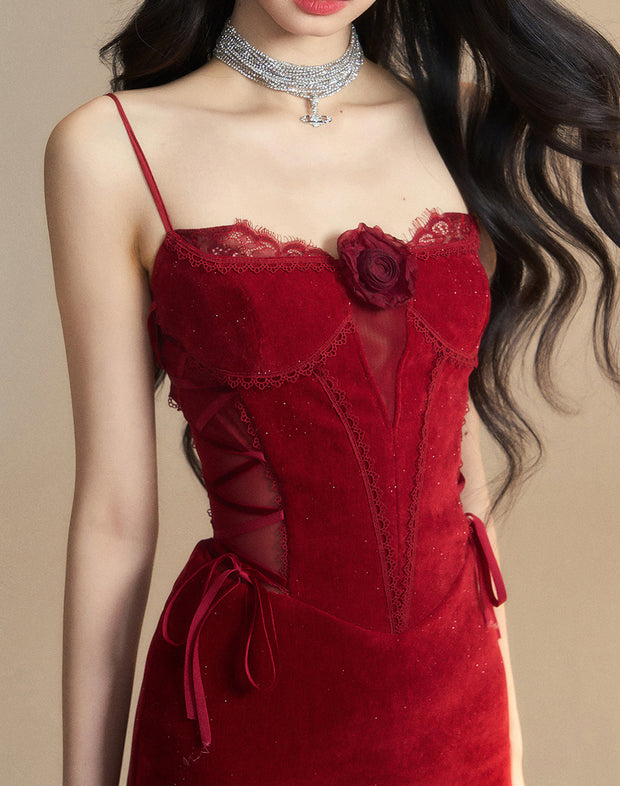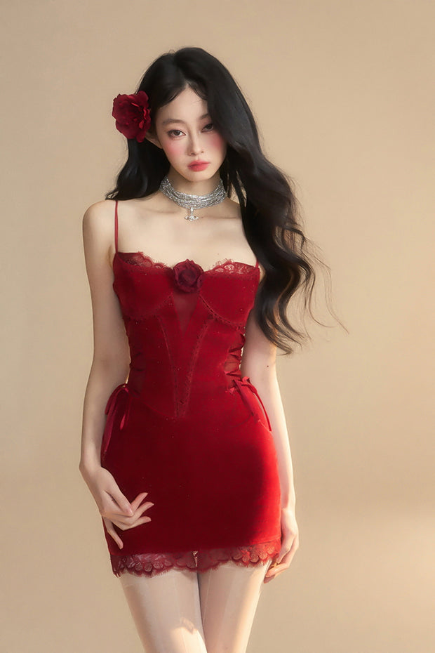 Scarlet red lace and sheer panels combine for a dangerously seductive look. Accented with corset details and a bold rose, this piece is made to steal the spotlight.