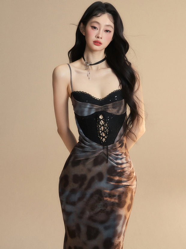 Bold leopard print meets glossy satin in a silhouette that hugs your curves with confidence. Designed for fearless nights, this dress embodies untamed glamour.