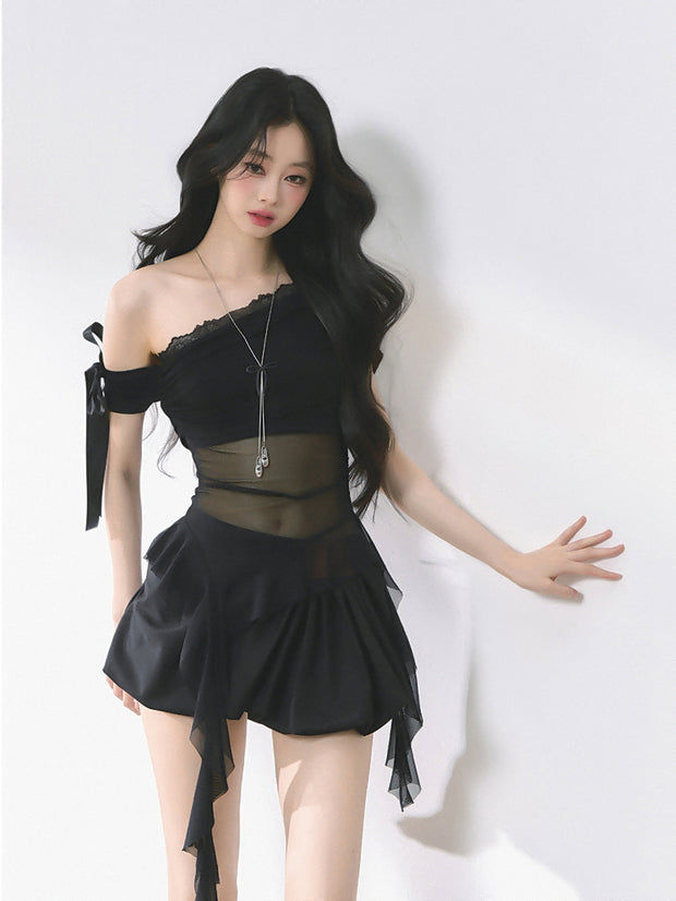 An asymmetric sheer top with lace accents that redefines sultry chic. Pair it with tailored pants for city glam or a mini skirt for bold midnight energy.