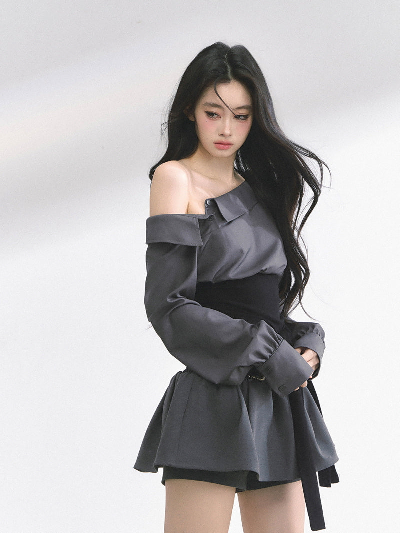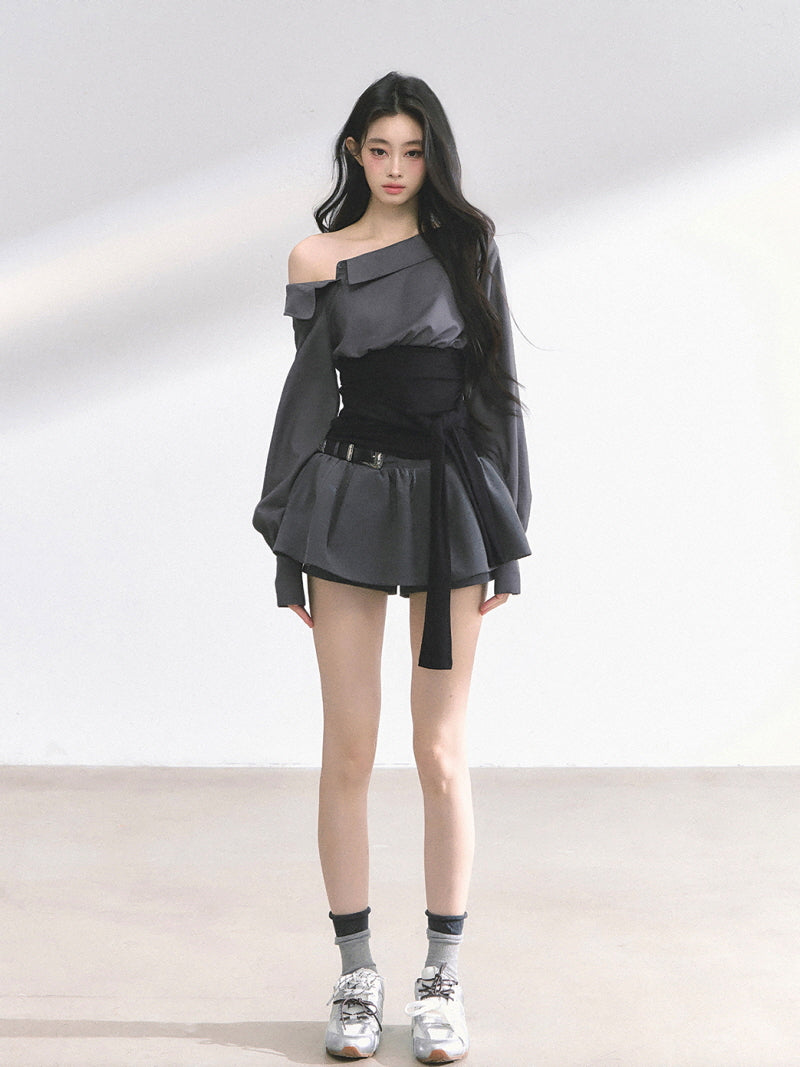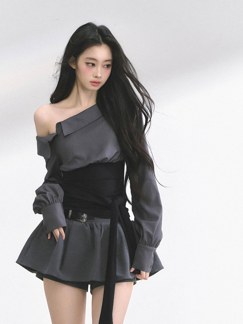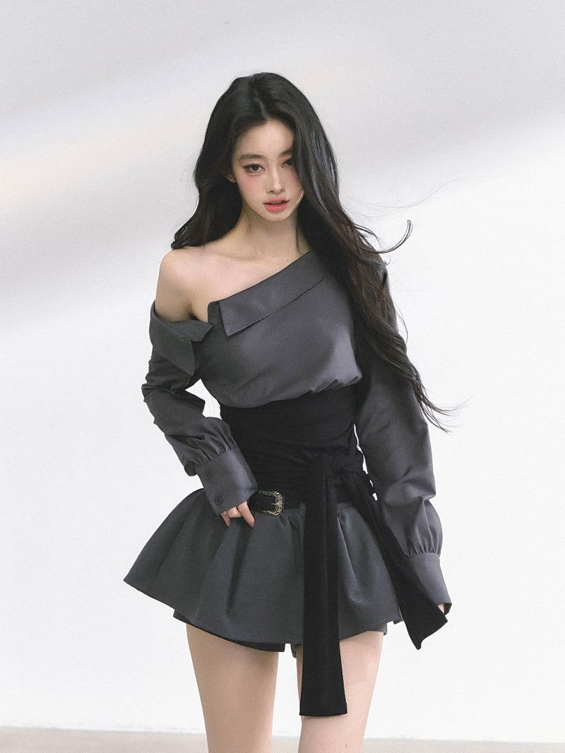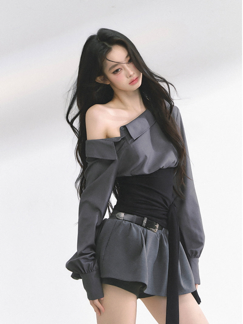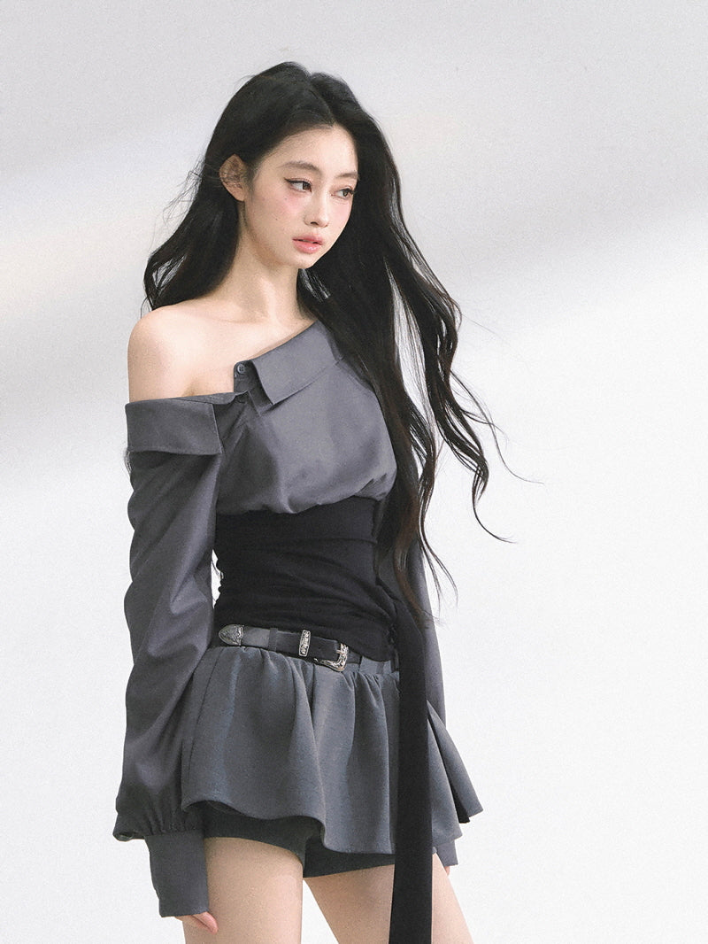 • Asymmetric neckline for offbeat shoulder reveal