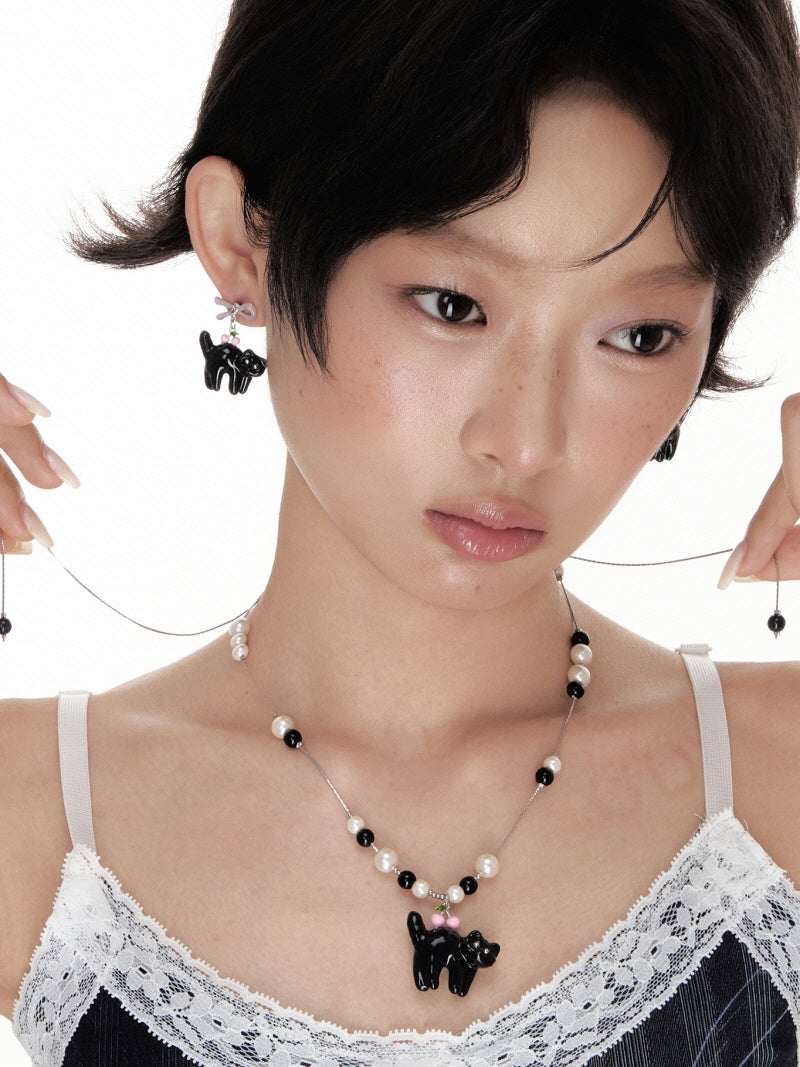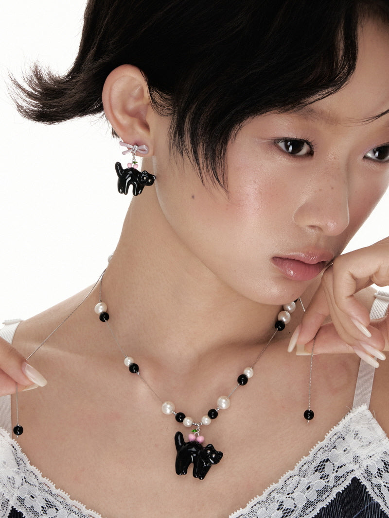 - Glossy black cat charm with pink cherry accent