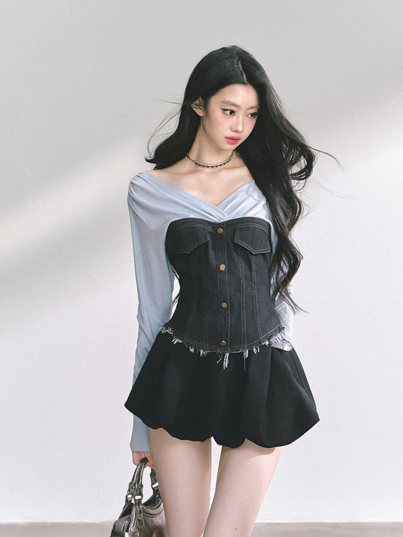 - Denim corset bodice enhances hourglass silhouette