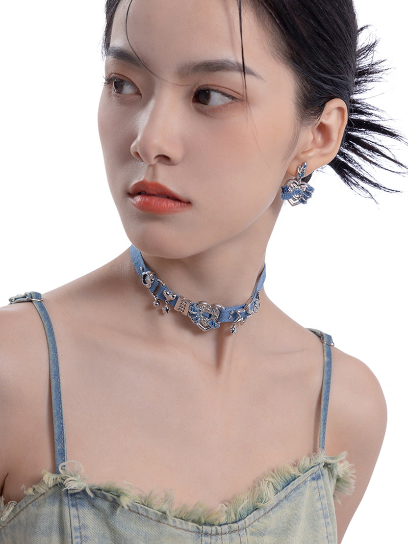 - Frayed denim heart drops with textured contrast