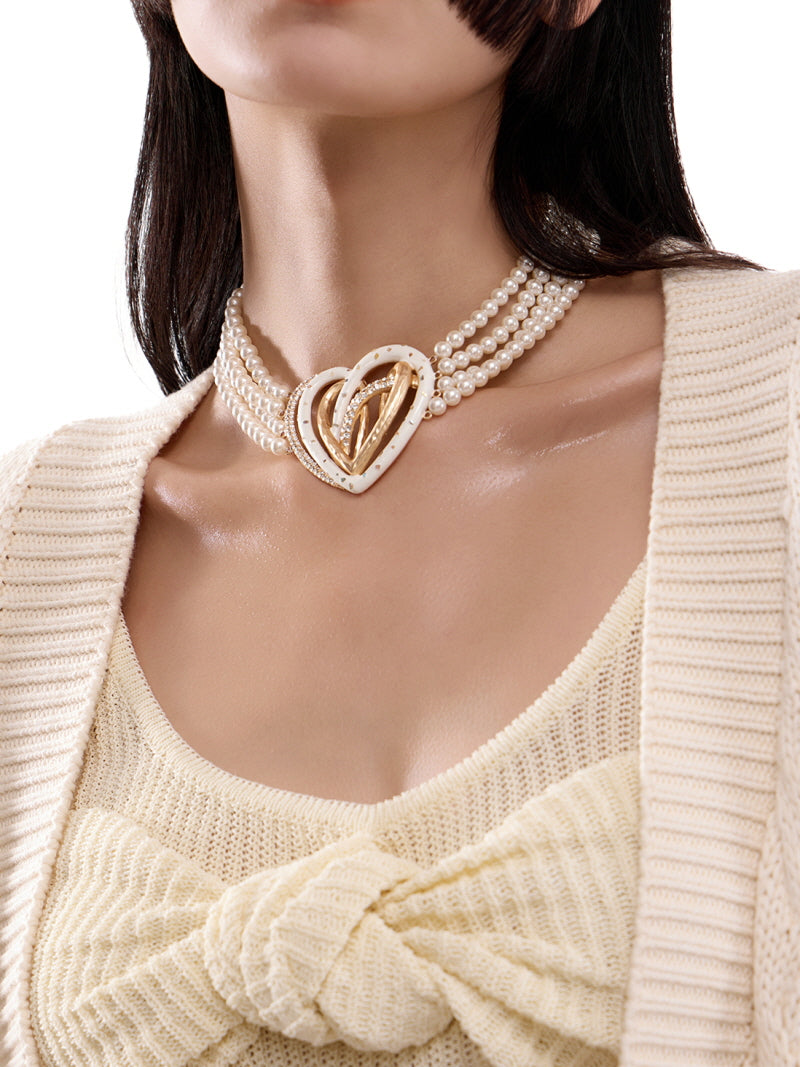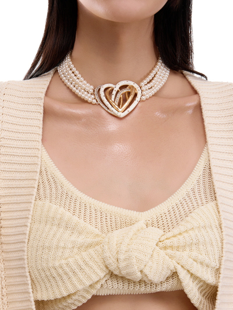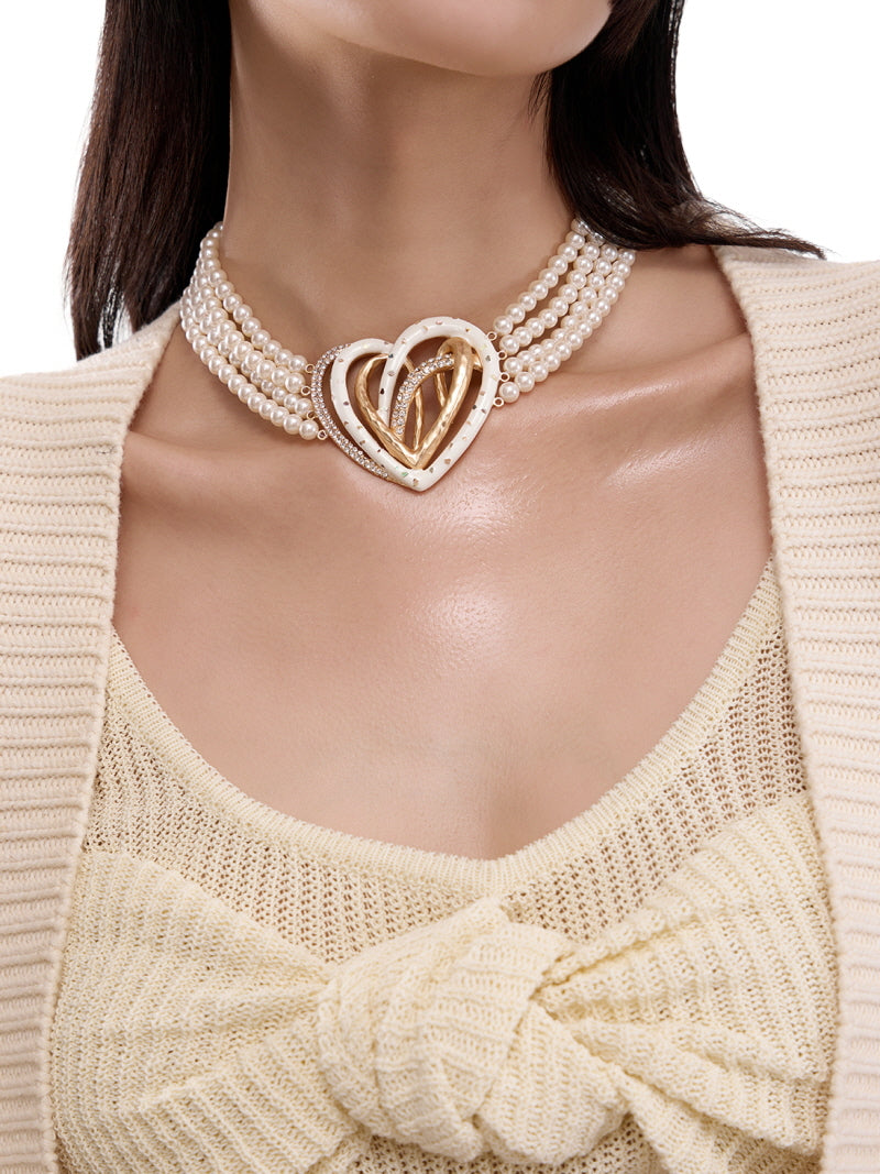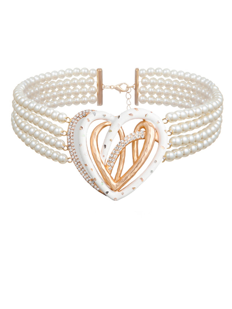 Golden Double Heart Pearl Choker Necklace