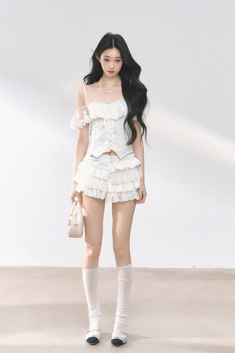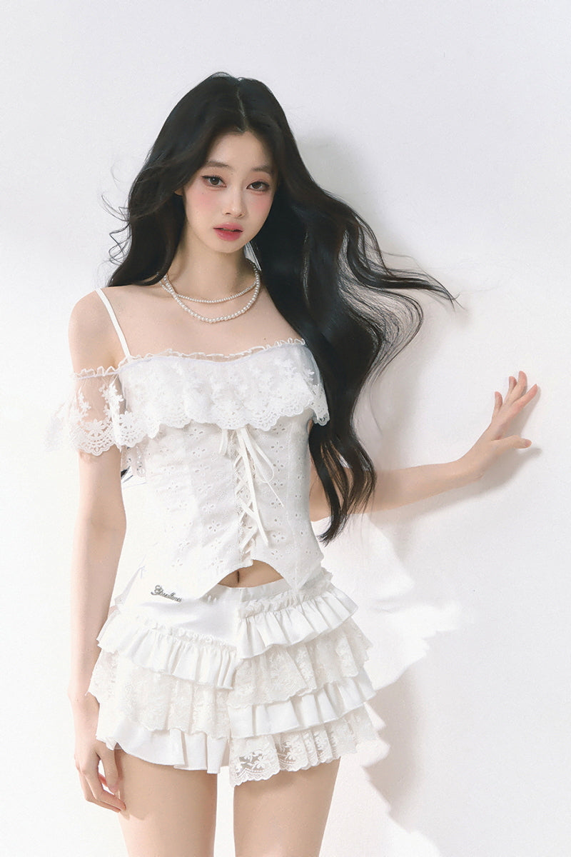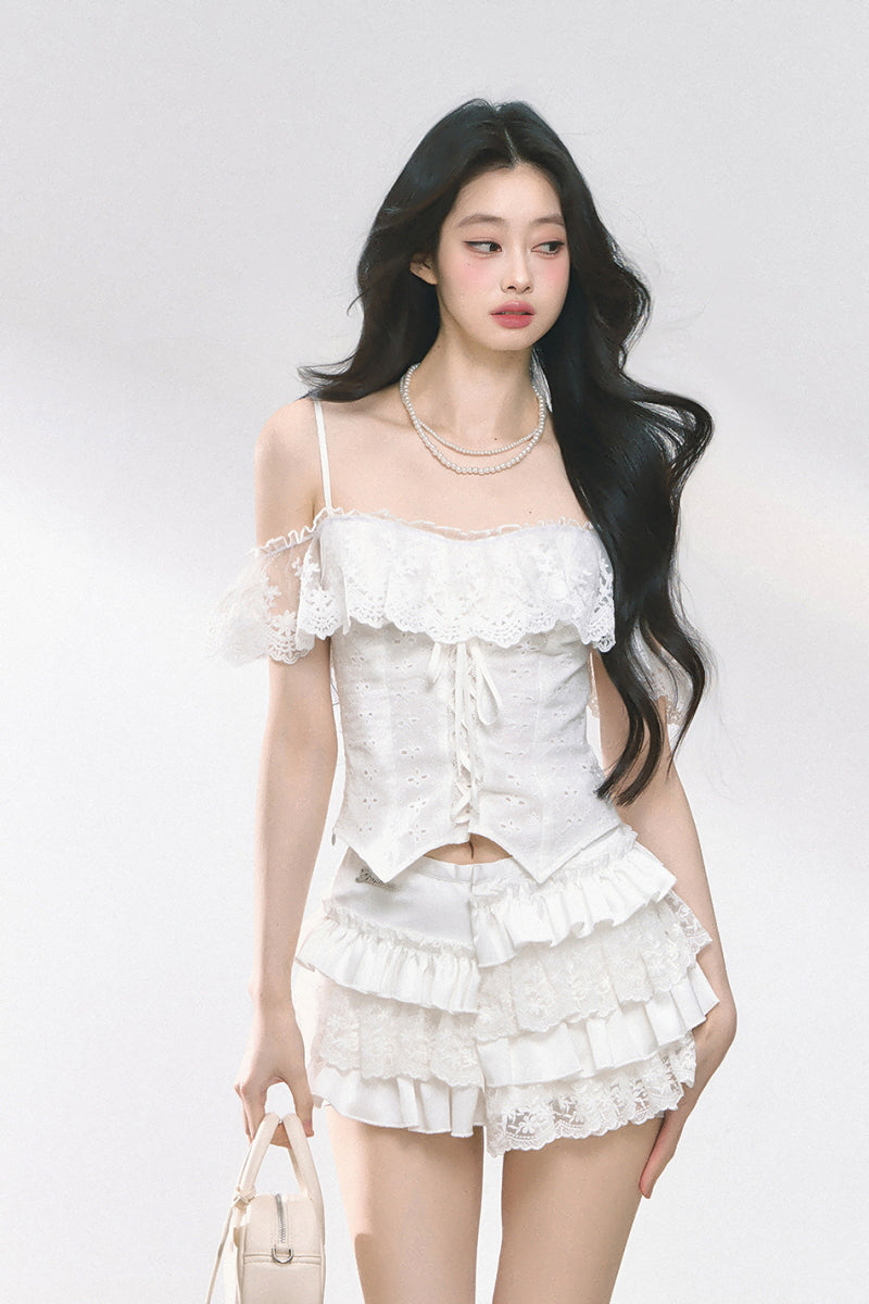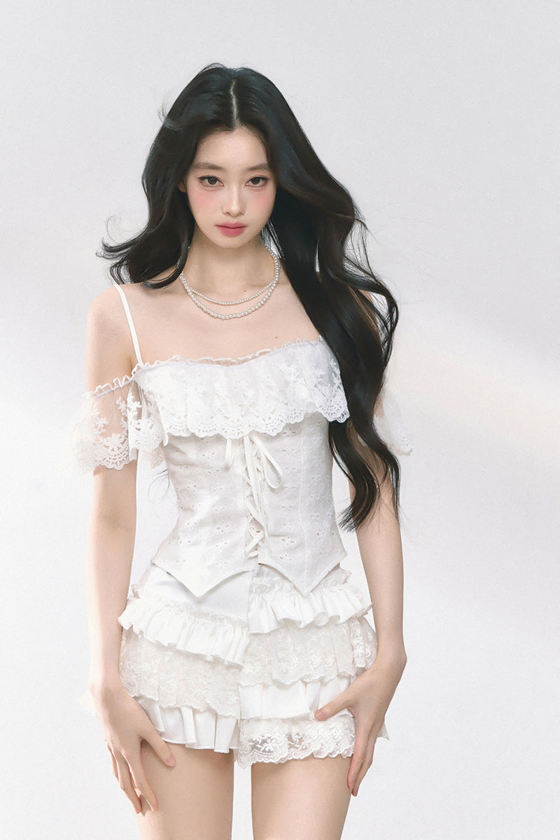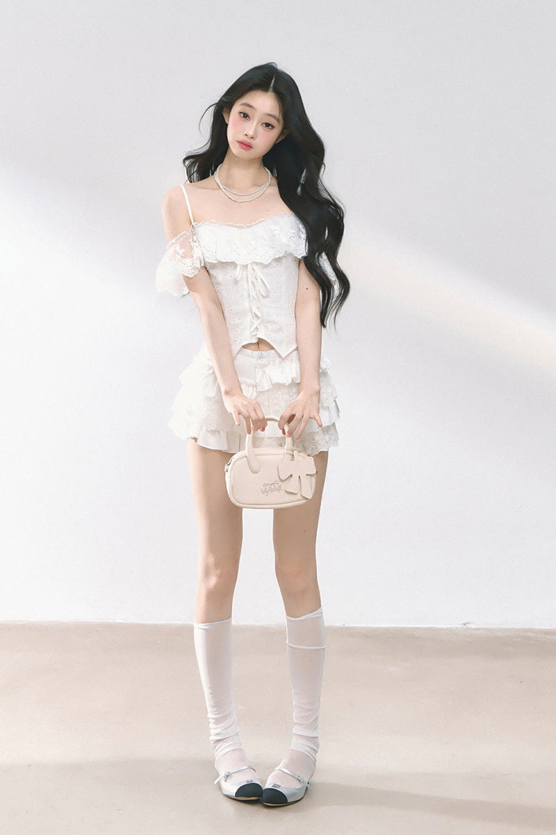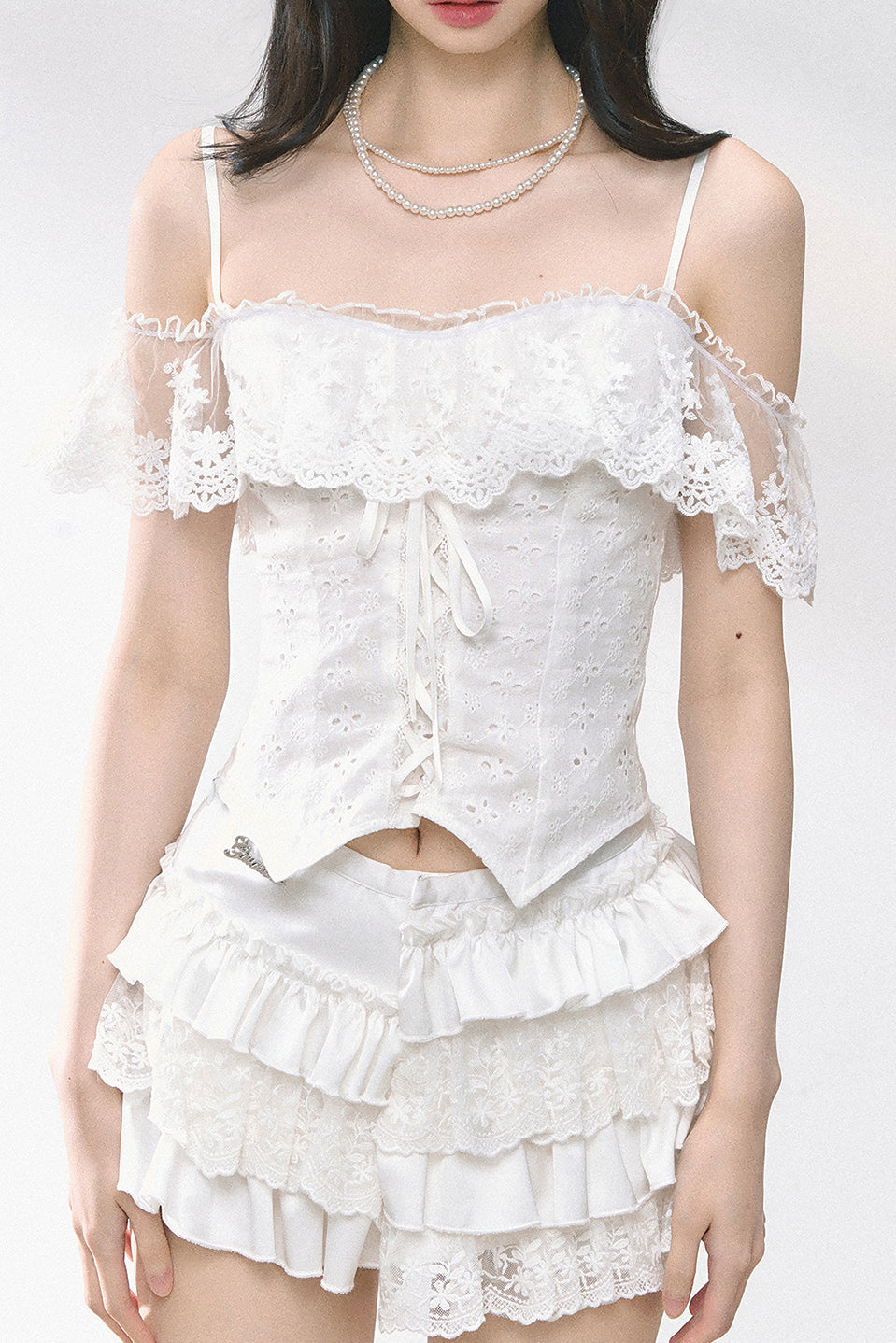 • Off-shoulder lace sleeves for a soft, romantic touch