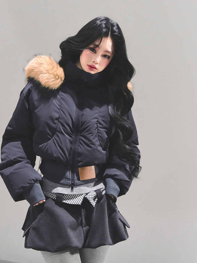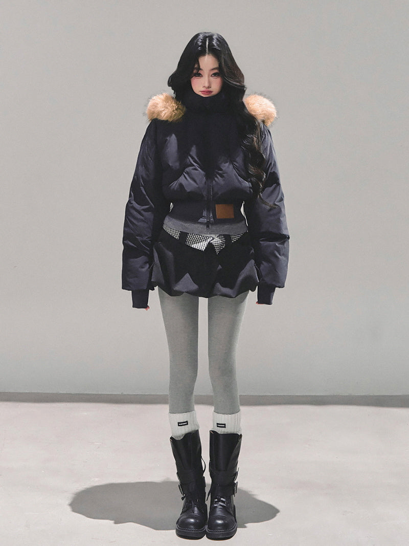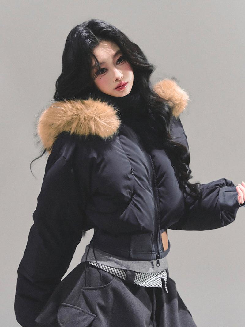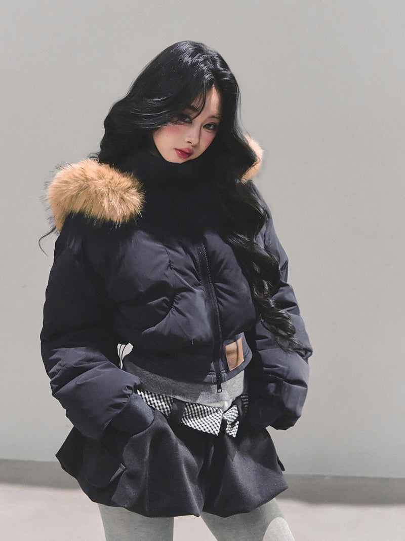 Minimal Fur Hood Puffer Jacket - Black