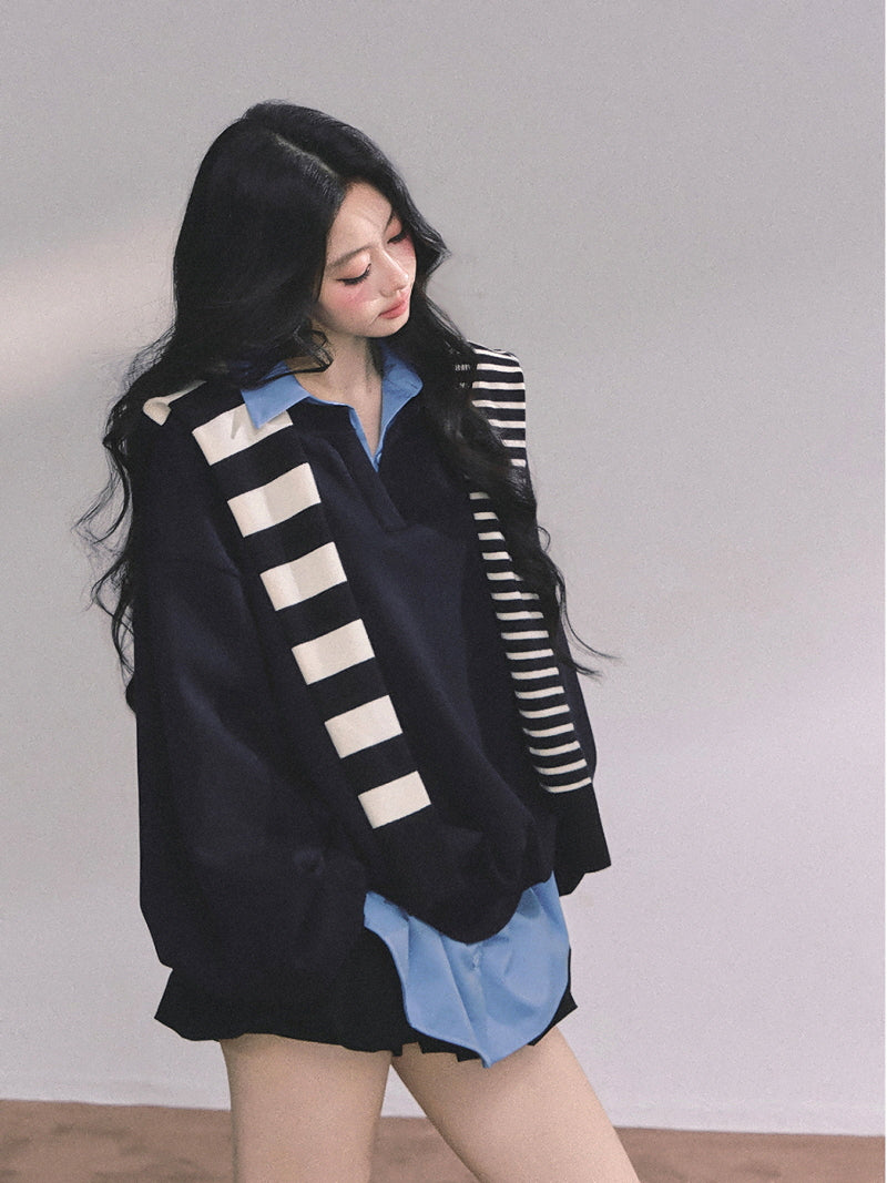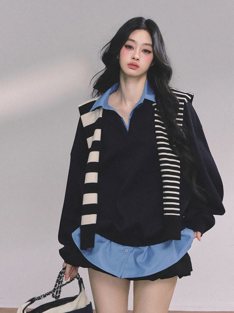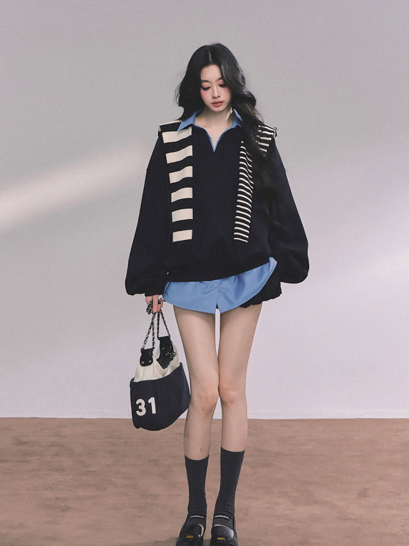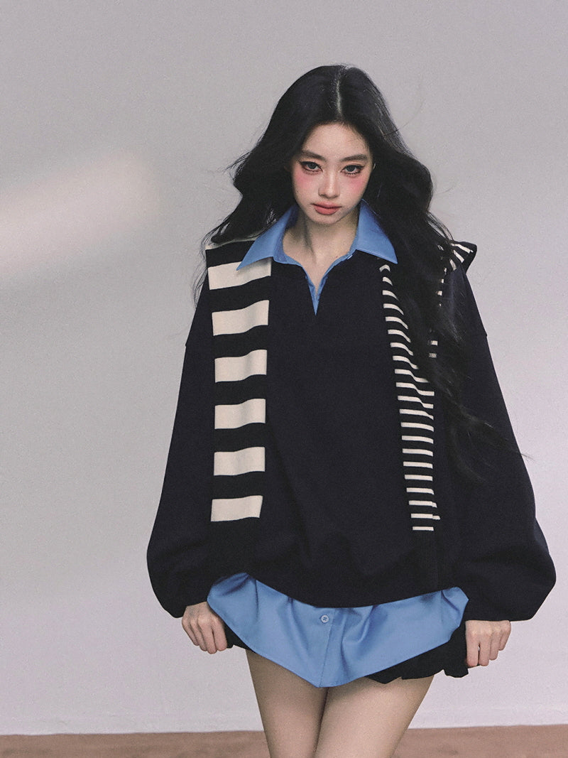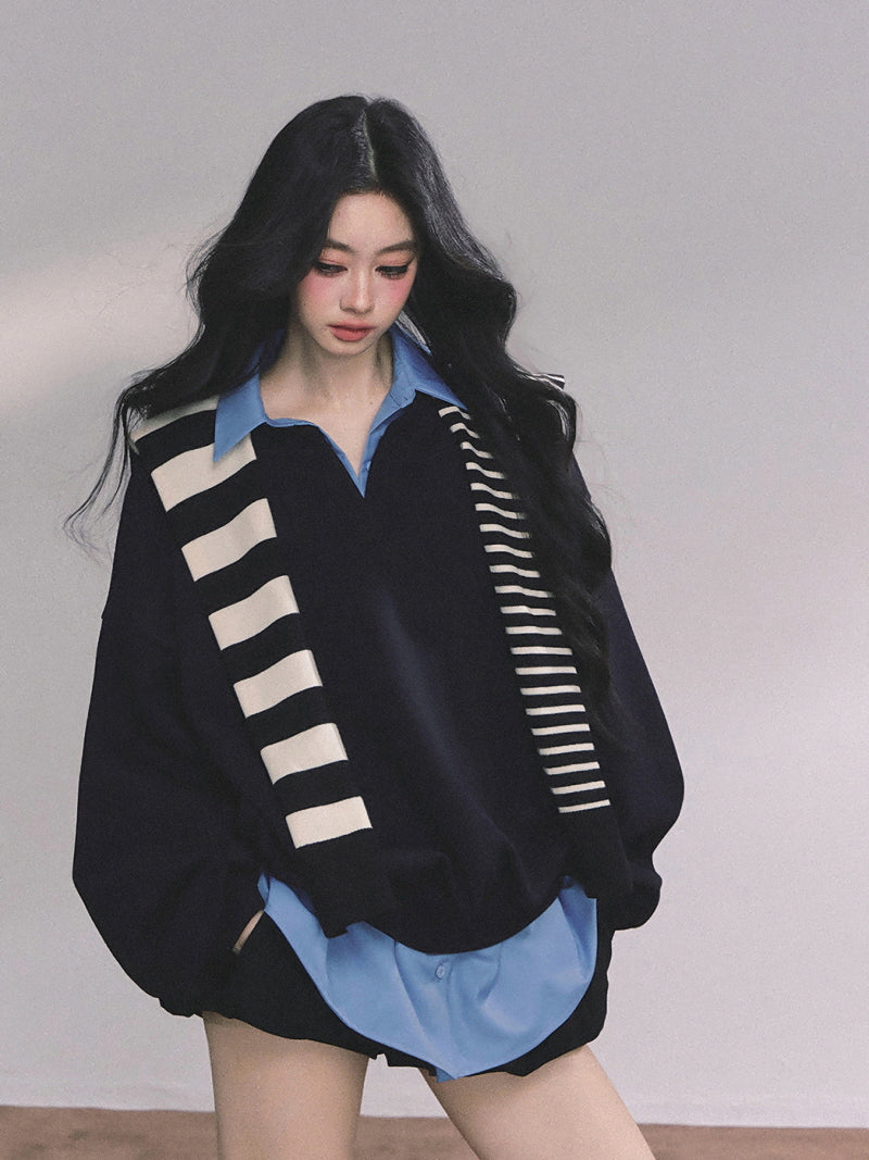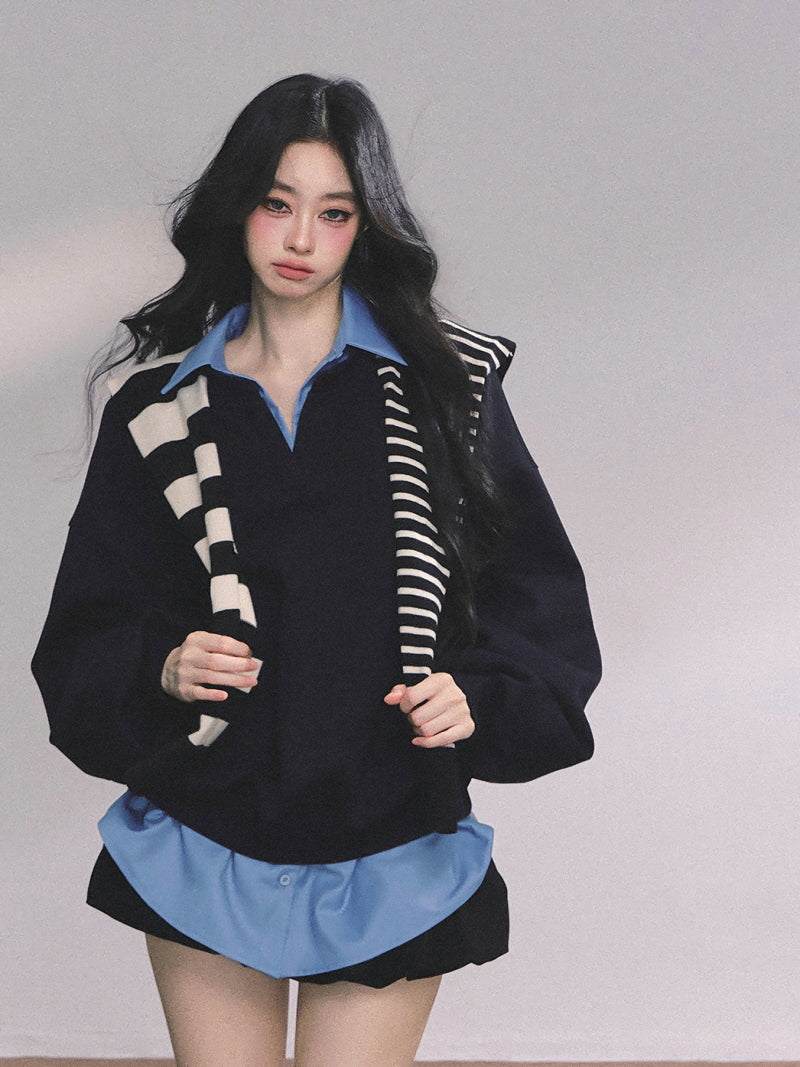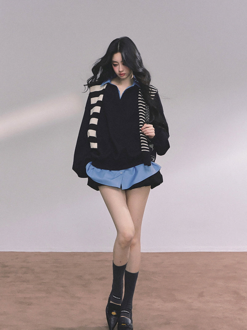 • Oversized pullover with a collared blue shirt layer