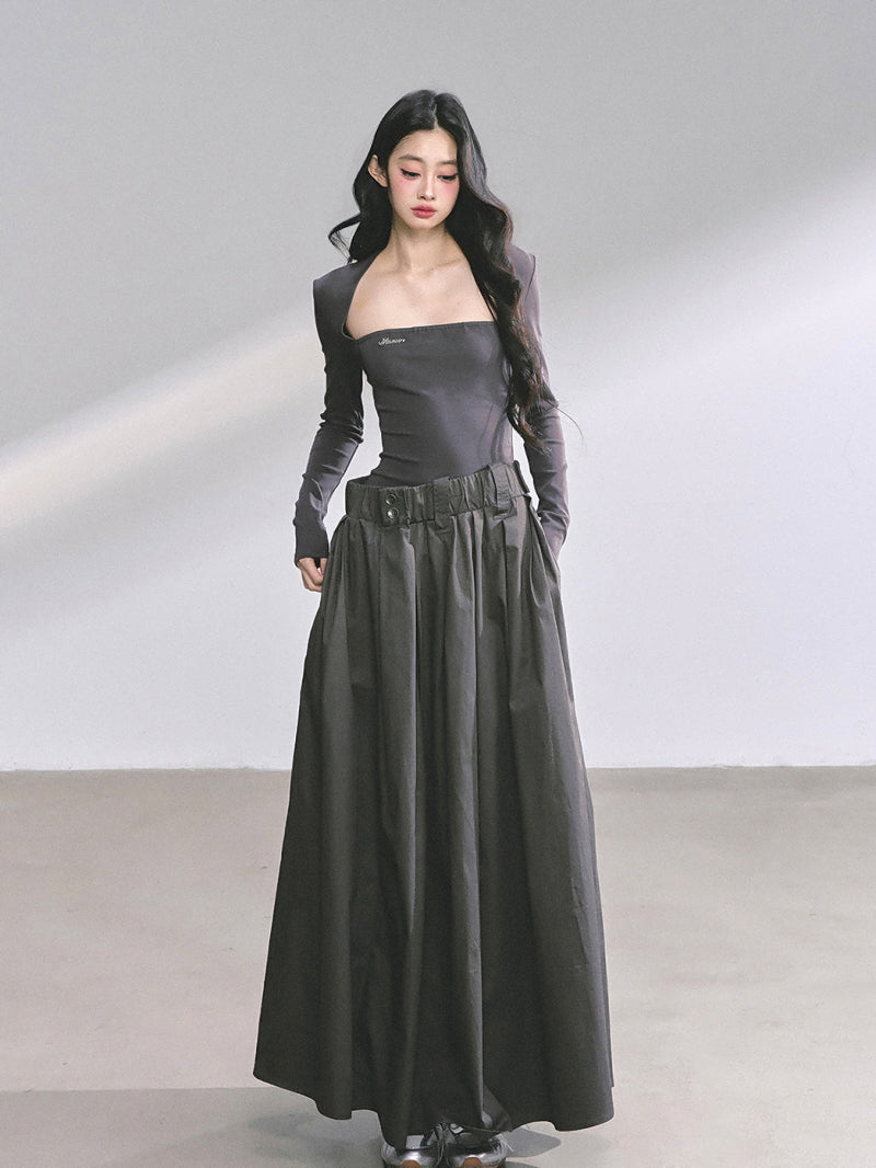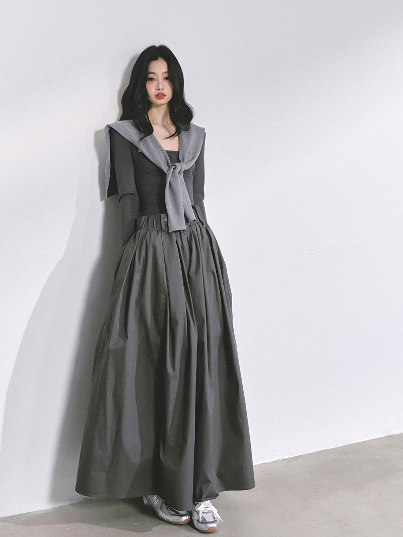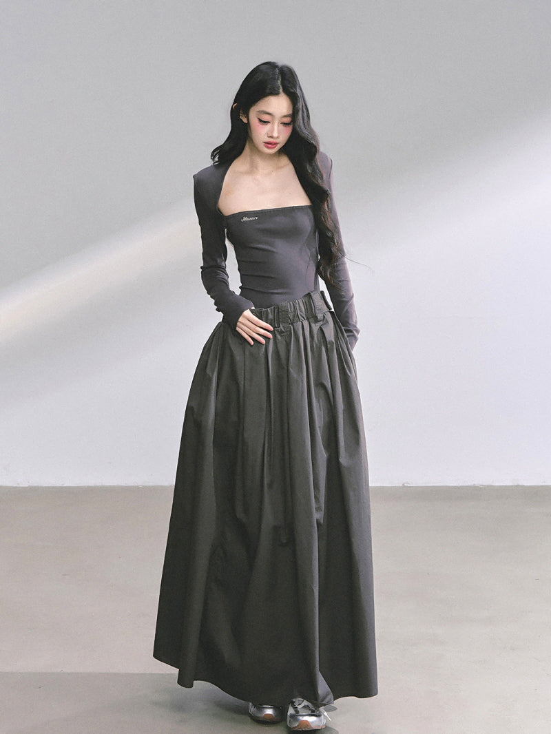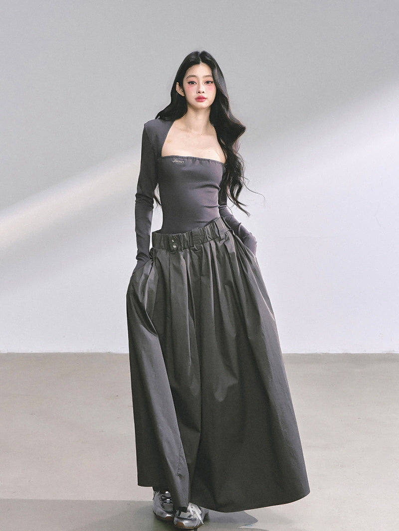 - Structured maxi skirt adds volume and contrast