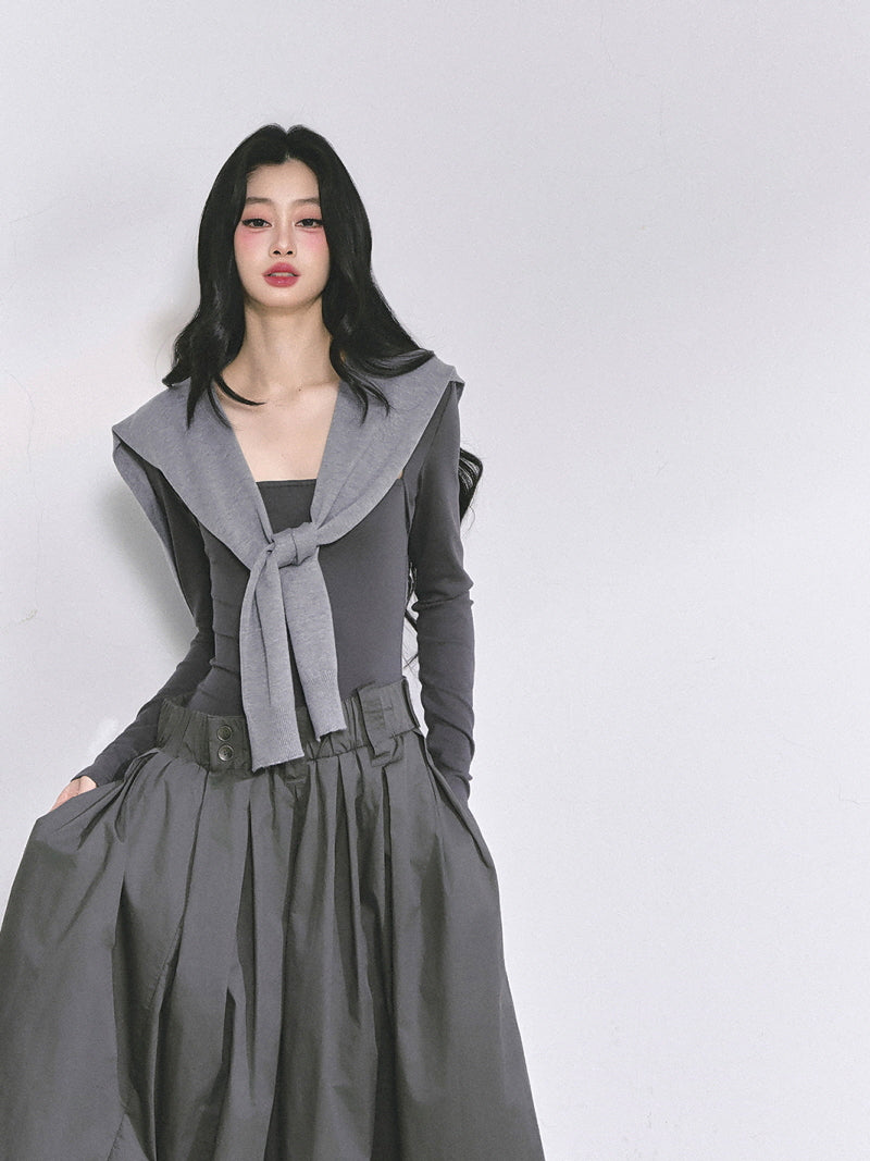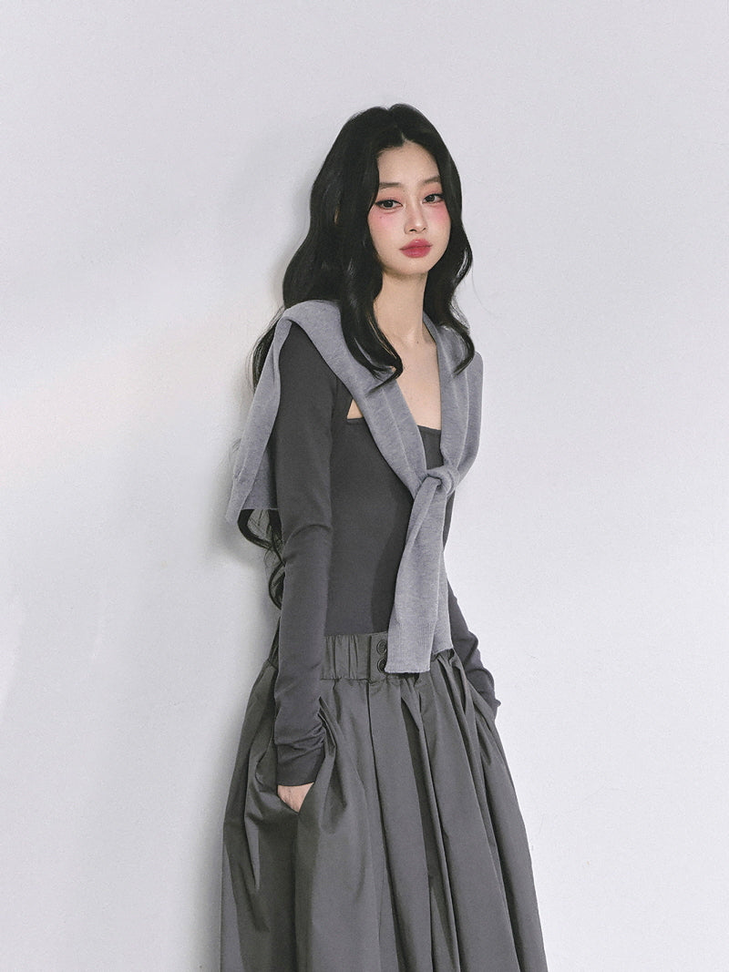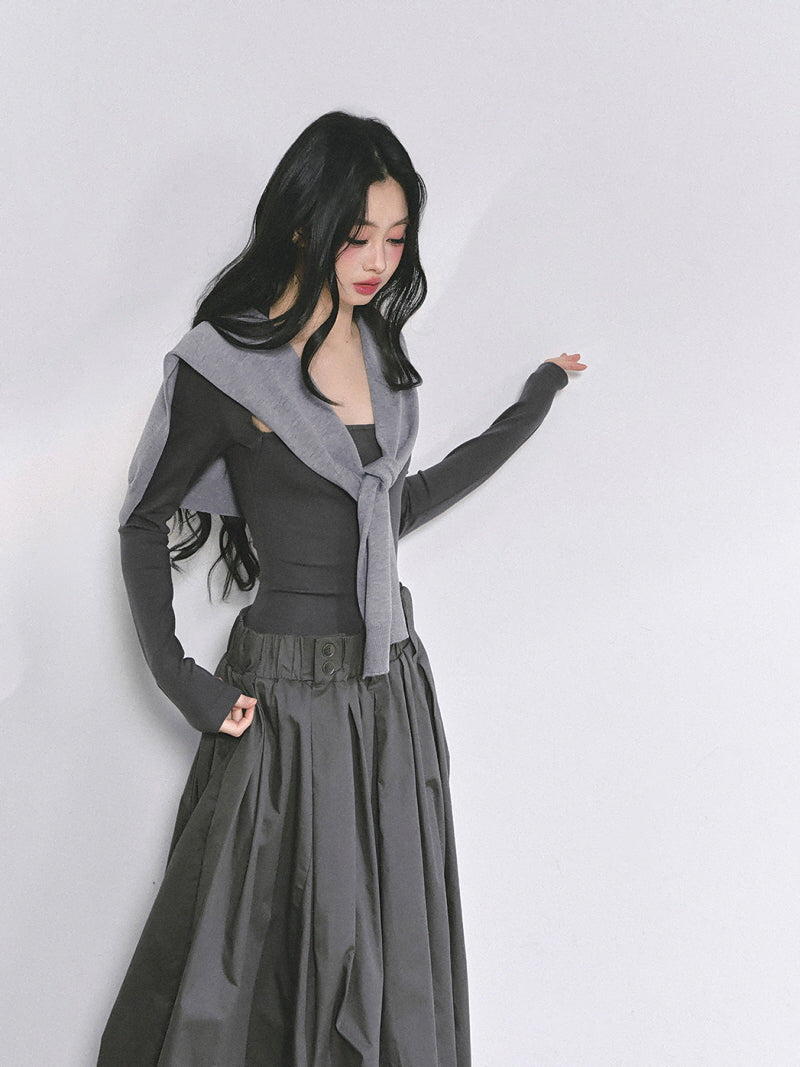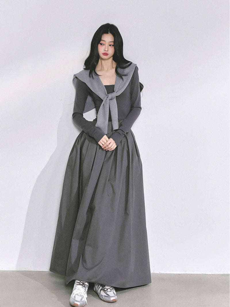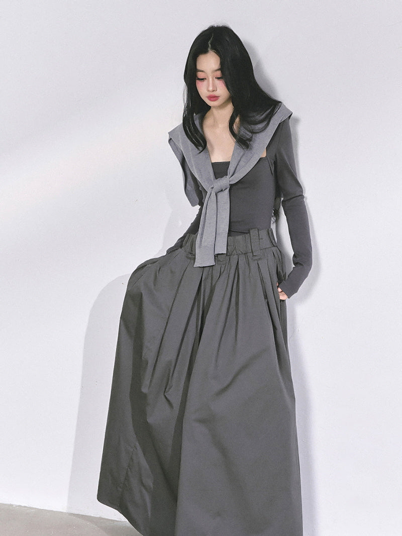 - Structured maxi skirt adds volume and contrast