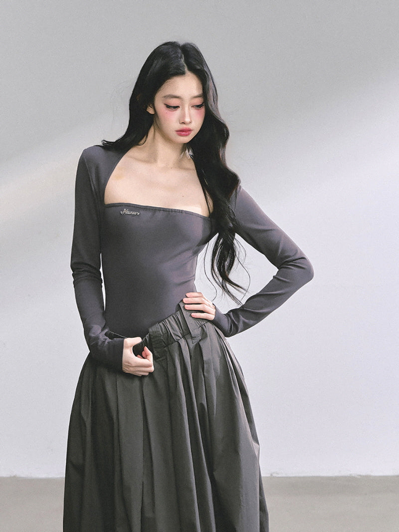 - Square neckline frames collarbone with elegance